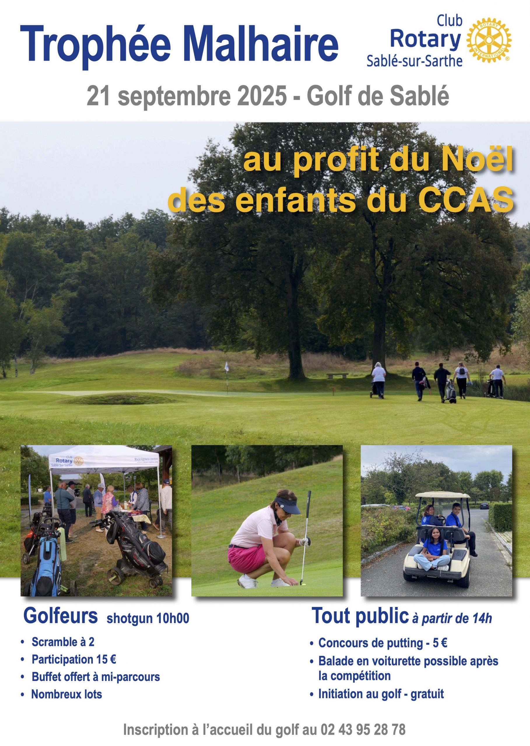 Le Rotary club de Sablé est heureux de vous inviter le dimanche 21 septembre 2025 à son tournoi annuel de golf caritatif en faveur du Noël des enfants défavorisés de Sablé.