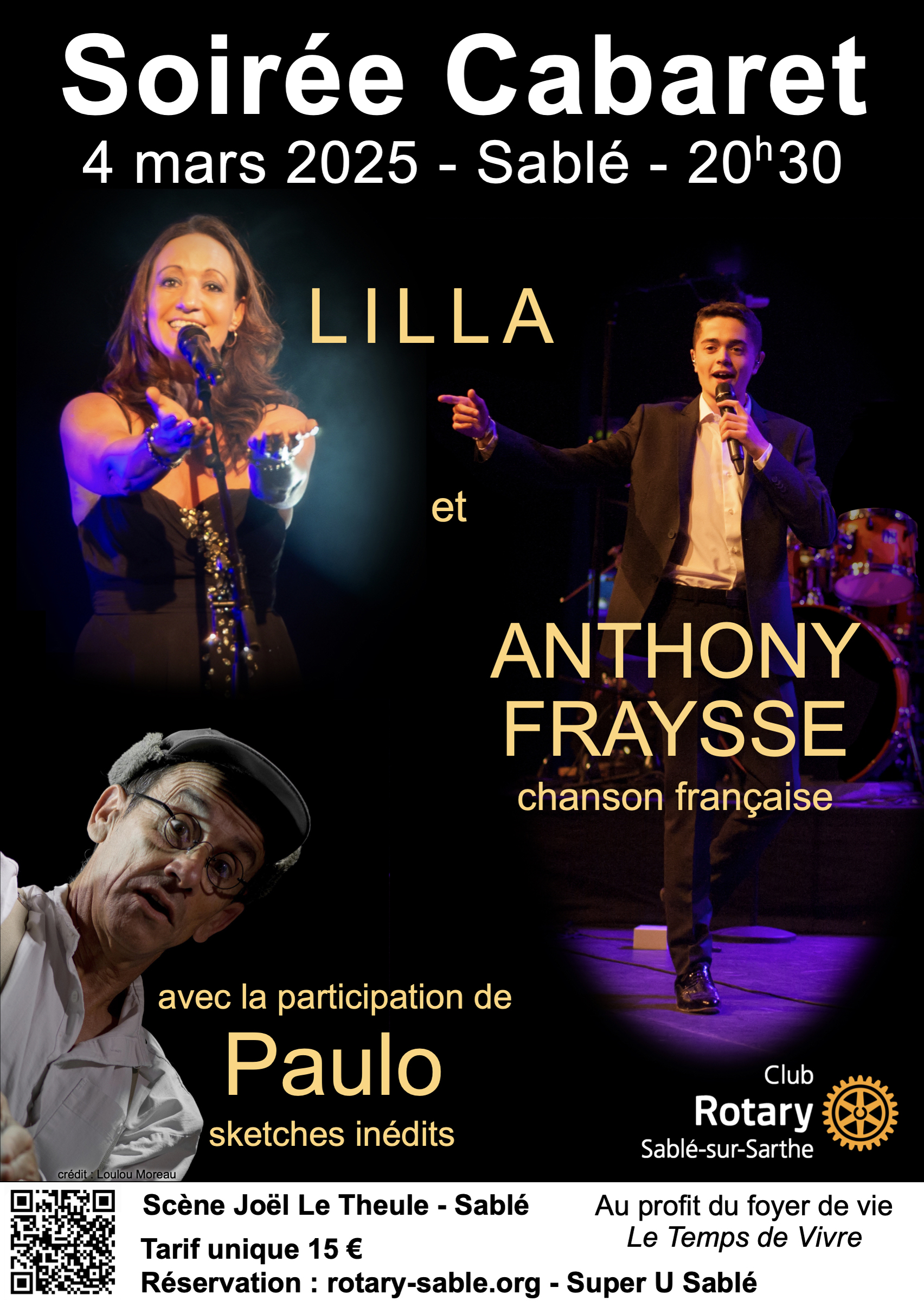 Suite à l’annulation des représentations de la troupe de théâtre de Solesmes, le Rotary club de Sablé vous convie le mardi 4 mars, à 20h30 scène JoëlLe Theule, pour vivre une soirée divertissante, entre humour et chansons.